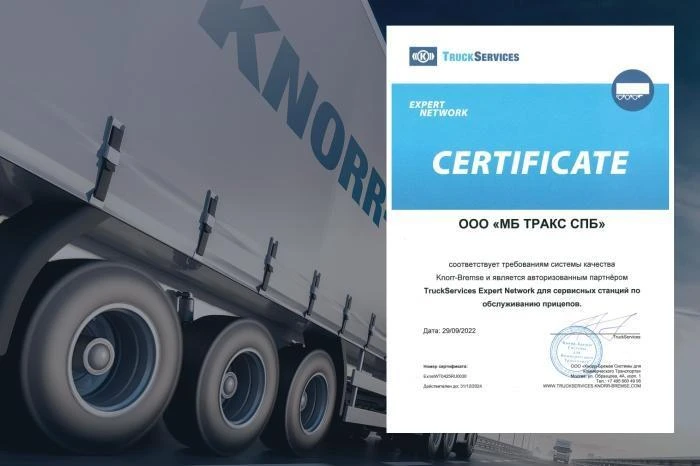 Автоцентр «МБ Тракс СПб» - соответствует требованиям системы качества Knorr-Bremse и является авторизованным партнером TruckServices Expert Network по обслуживанию прицепов.